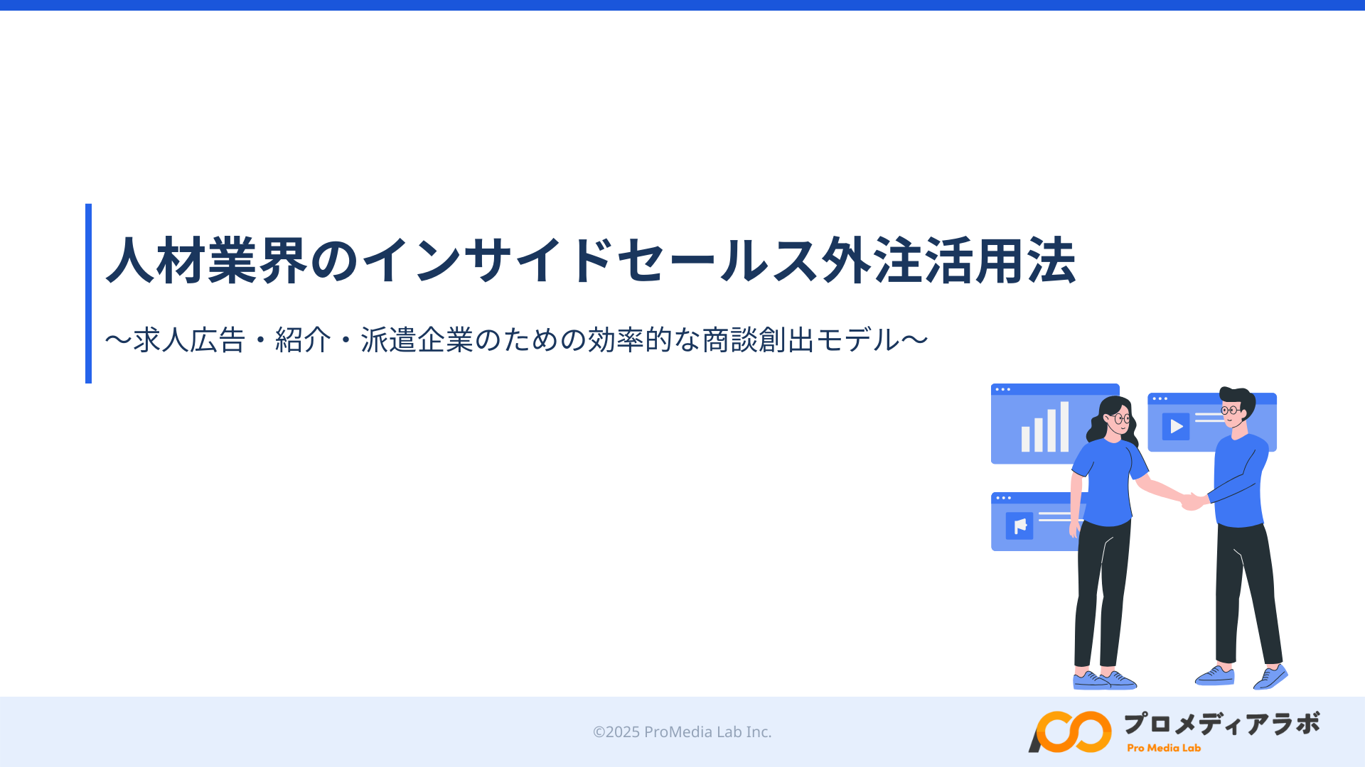 人材業界のインサイドセールス外注活用法~求人広告・紹介・派遣企業のための効率的な商談創出モデル~ 2026 1/30 お役立ち資料 人材業界向けに、インサイドセールス外注のメリット・デメリット、内製との違い、ROI比較、失敗しない活用法を具体的に解説した資料です。 ダウンロード お役立ち資料 人材業界 営業代行のトラブルとは?失敗事例から学ぶ契約前の対策と回避策を解説 この記事を書いた人 minami 関連記事関連する記事はまだ見つかりませんでした。